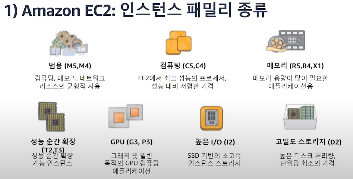 - 각 인스턴스 유형은 서로 다른 컴퓨팅, 메모리, 스토리지 용량을 제공하는데, 이 용량에 따라 서로 다른 인스턴스 패밀리로 분류