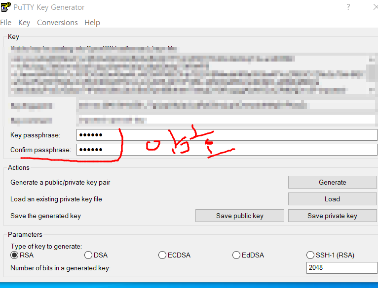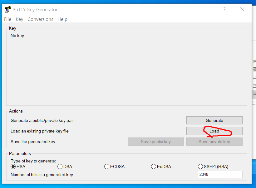 Load์ ํ์ผ์ ์ฒจ๋ถ ํ Save Private Key ํด๋ฆญ ํ๊ณ PPK ํ์ผ์ ์ ์ฅ