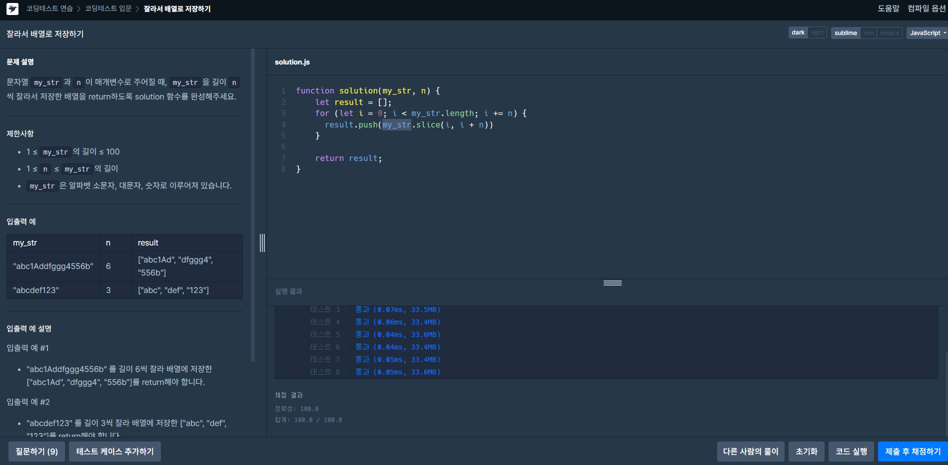 풀이 과정: 매개변수 my_str index만큼 for문을 순회하고 for문의 증감을 n 개수 만큼으로 할당하고 slice로 각각의 문자를 잘라준다. ex 1번순회: 0, 6, 2번순회: 6, 12, 3번순회: 12, 18