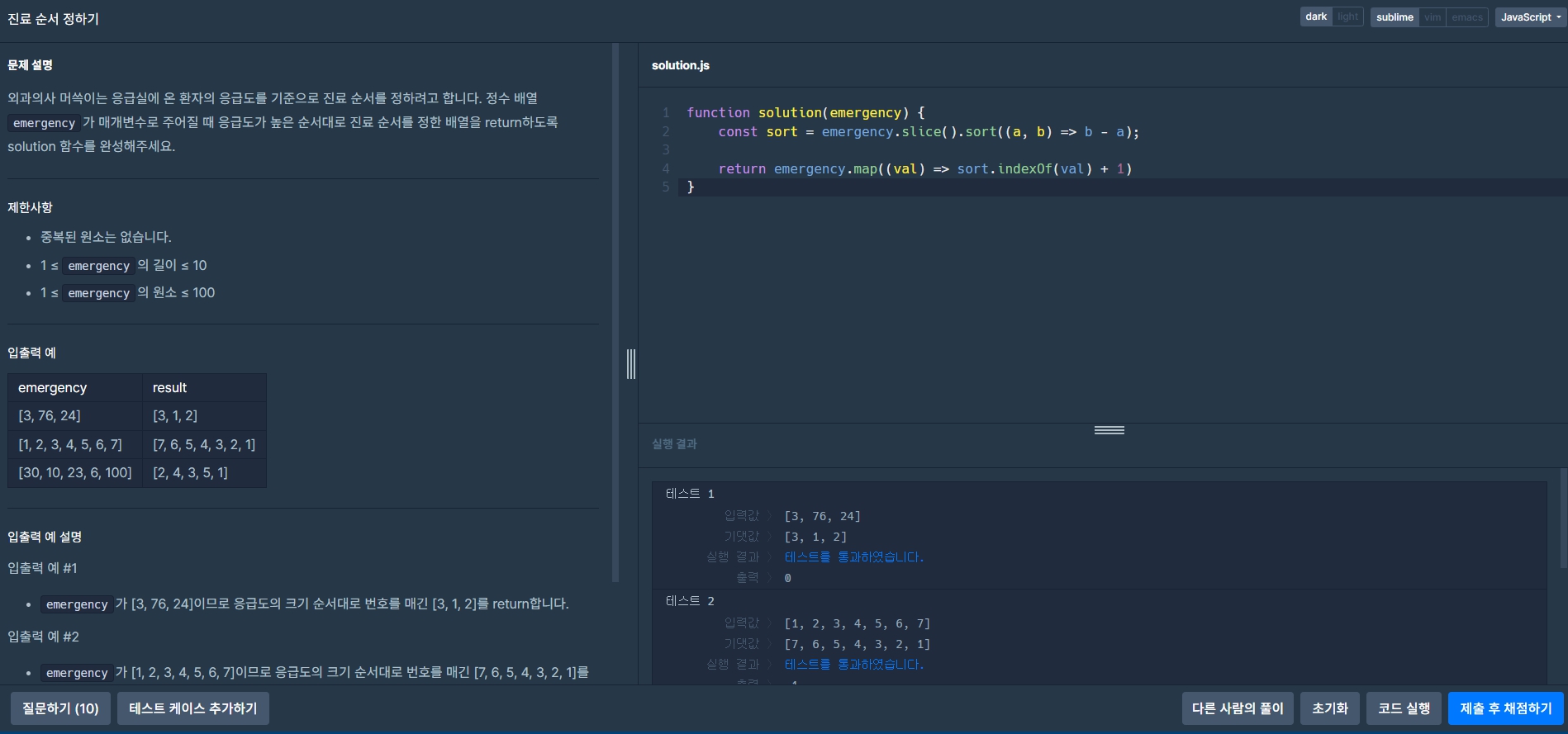 풀이 과정: 매개변수에 값을 sort로 내림차순으로 정렬을한 배열을 하나 복사하고 원본 배열에 map을 순회하면서 복사한 배열에 indexOf 메소드로 index를 찾아서 반환하고 배열은 0부터 시작하기 때문에 +1을 해준다.