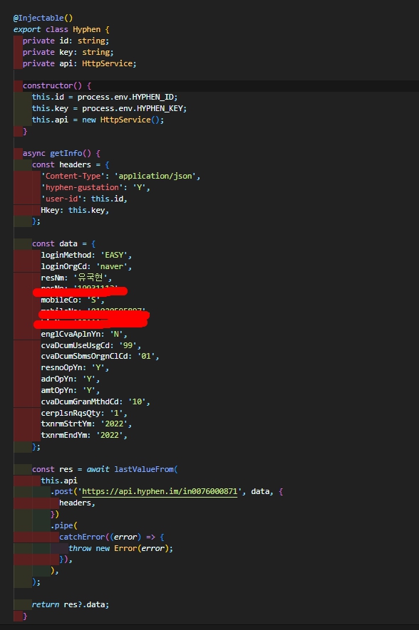 - httpService module ์ด๊ธฐ ๊ฐ์ ์ ํ ํด์ค์ getInfo method์์ ์ธ๋ถ api์ ํต์ ํ ์ ์๋ค.