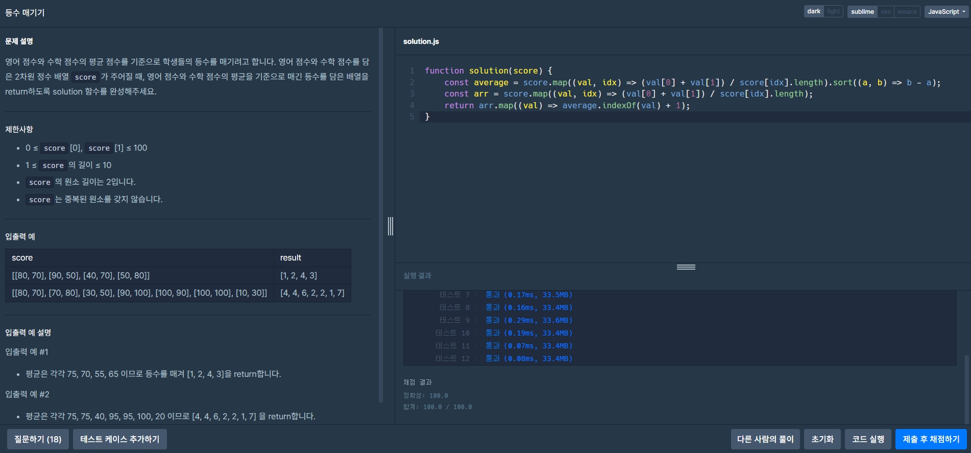 풀이 과정: 매개변수로 넘어오는 2차원배열 score에 map 함수로 평균 점수 값을 구하고 sort 함수로 내림차순 정렬을 한다. 정렬하지 않은 배열을 평균값을 구해서 하나더 만들고 map을 돌려서 내림차순으로 정렬된 배열에 indexOf +1 을 해서 값을 반환