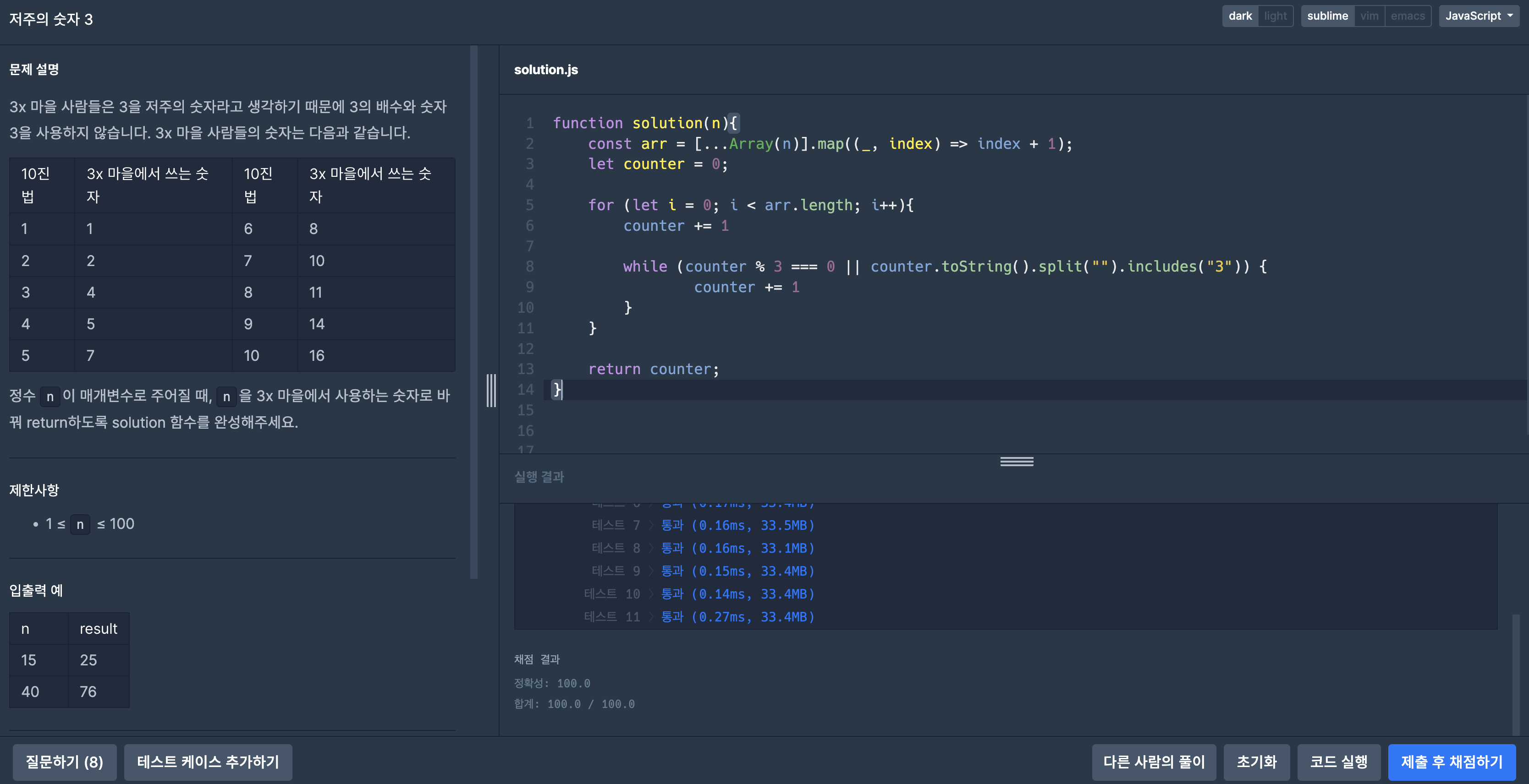 풀이 과정: 매개변수 n에 정수를 배열로 변환해서 정수 개수만큼 숫자를 정렬하고 counter 변수를 만들고 for문으로 arr 길이 만큼 순회를 하면서 counter 1씩 더하고 while문에 3의 배수인 값과 3이 들어간 숫자 while문을 타서 1을 더 증각해서 값을 반환.