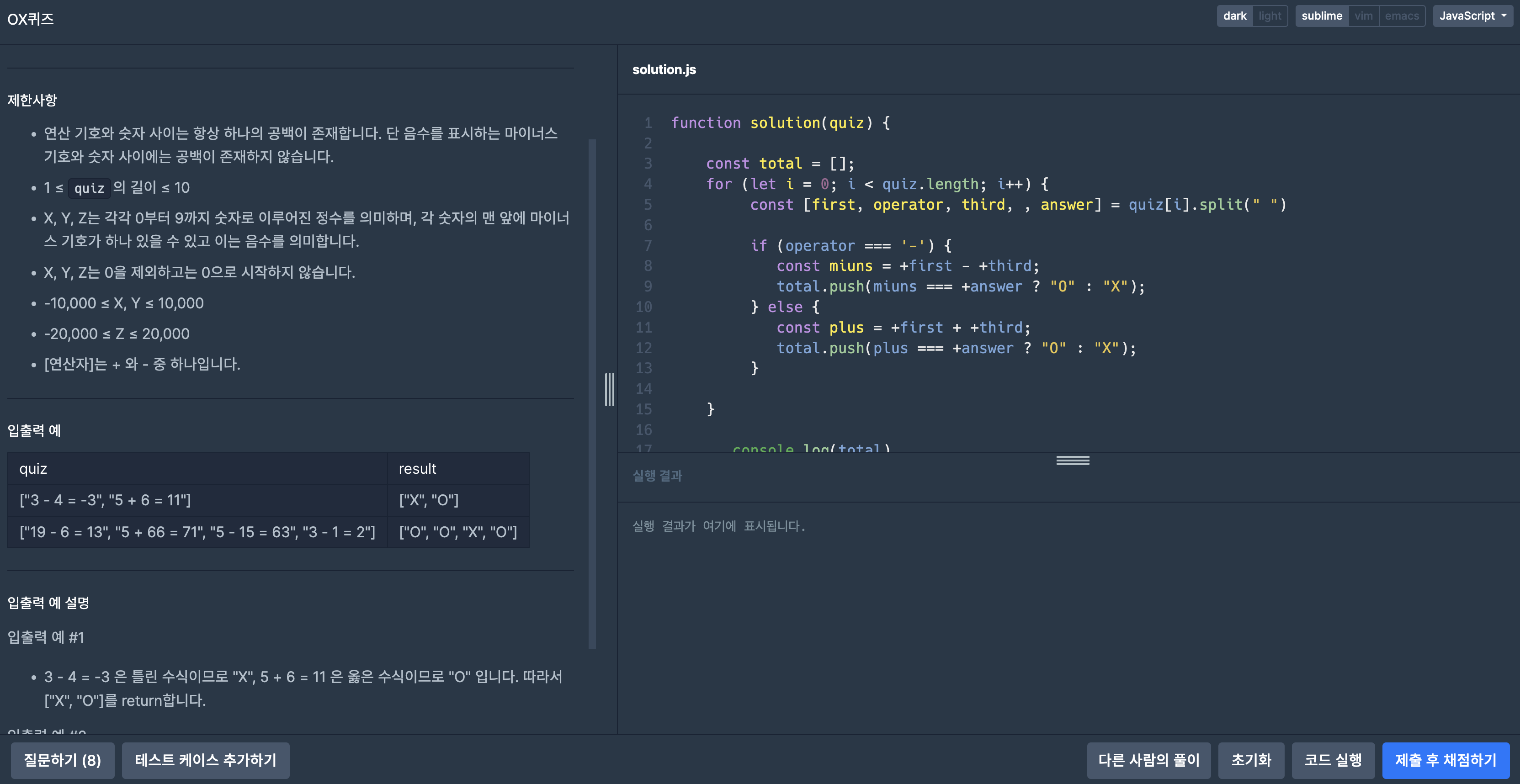 풀이 과정: 매개변수 quiz에 원소들을 for문을 돌려 순회하고 원소에 값들을 split하고 구조분해할당으로 if 조건문으로 값을 할당.