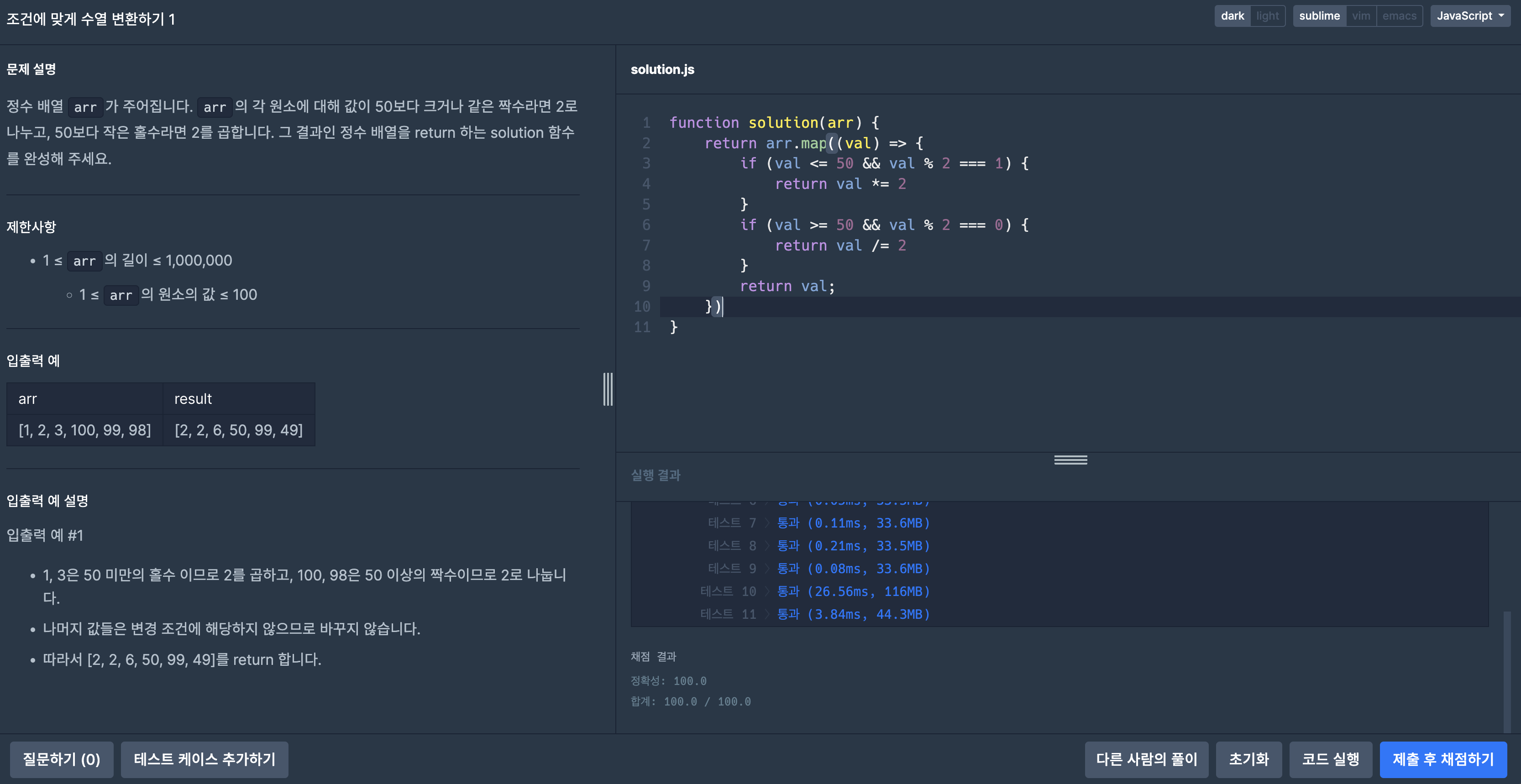 풀이 과정: 매개변수 arr넘오고 배열에 원소를 순회하기위해서 map함수를 사용하고 원소에 값으로 if 조건을 만들어준다 설명에서 말했듯이 val 값이 50보다 크거나 짝수라면 나누기 또는 짝거나 홀수라면 곱하기로 원소에 값들은 반환한다.