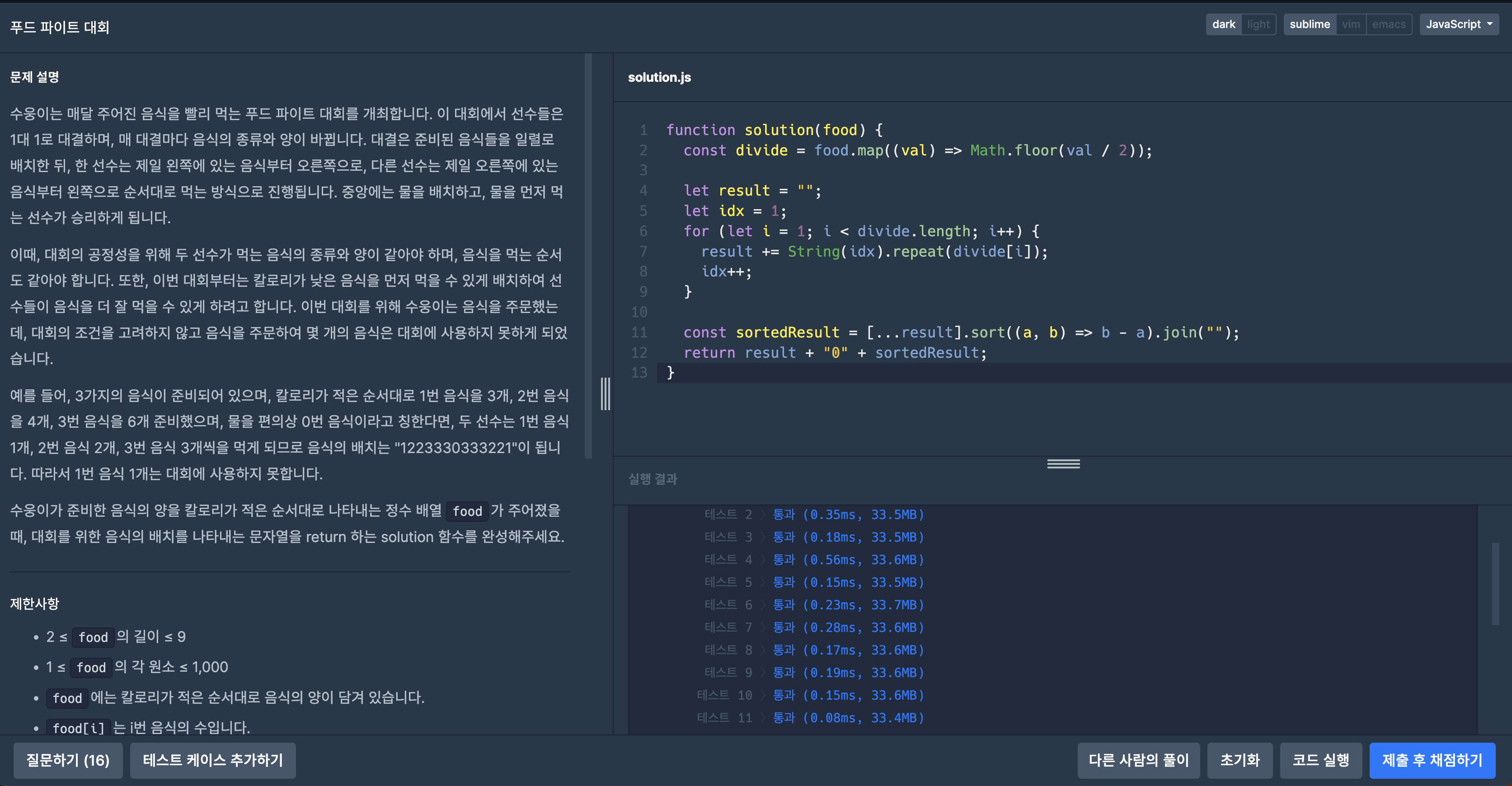 풀이 과정: 매개변수 food 배열에 문제설명에 음식개수를 2로 나눠서 Math.floor로 소수점을 내려서 새로운 배열을 만든다. divide 배열을 순회하면서 2로나눈 원소값만큼 idx 값을 돌려서 result 문자열에 놓고 sort함수로 내림차운 새로운 배열은 만들고 문자열을 조합해서 return