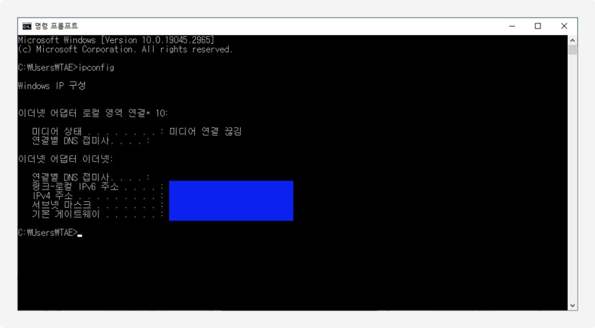 - 명령 프롬프트 창이 열리면, "ipconfig"를 입력하고 [Enter] 키를 누릅니다.