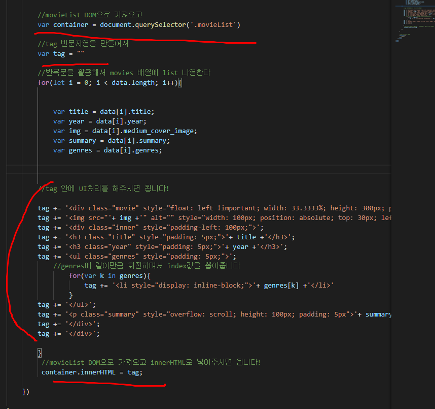 DOM 으로 movieList 값을 가져오고 tag 빈 문자열을 만듭니다!