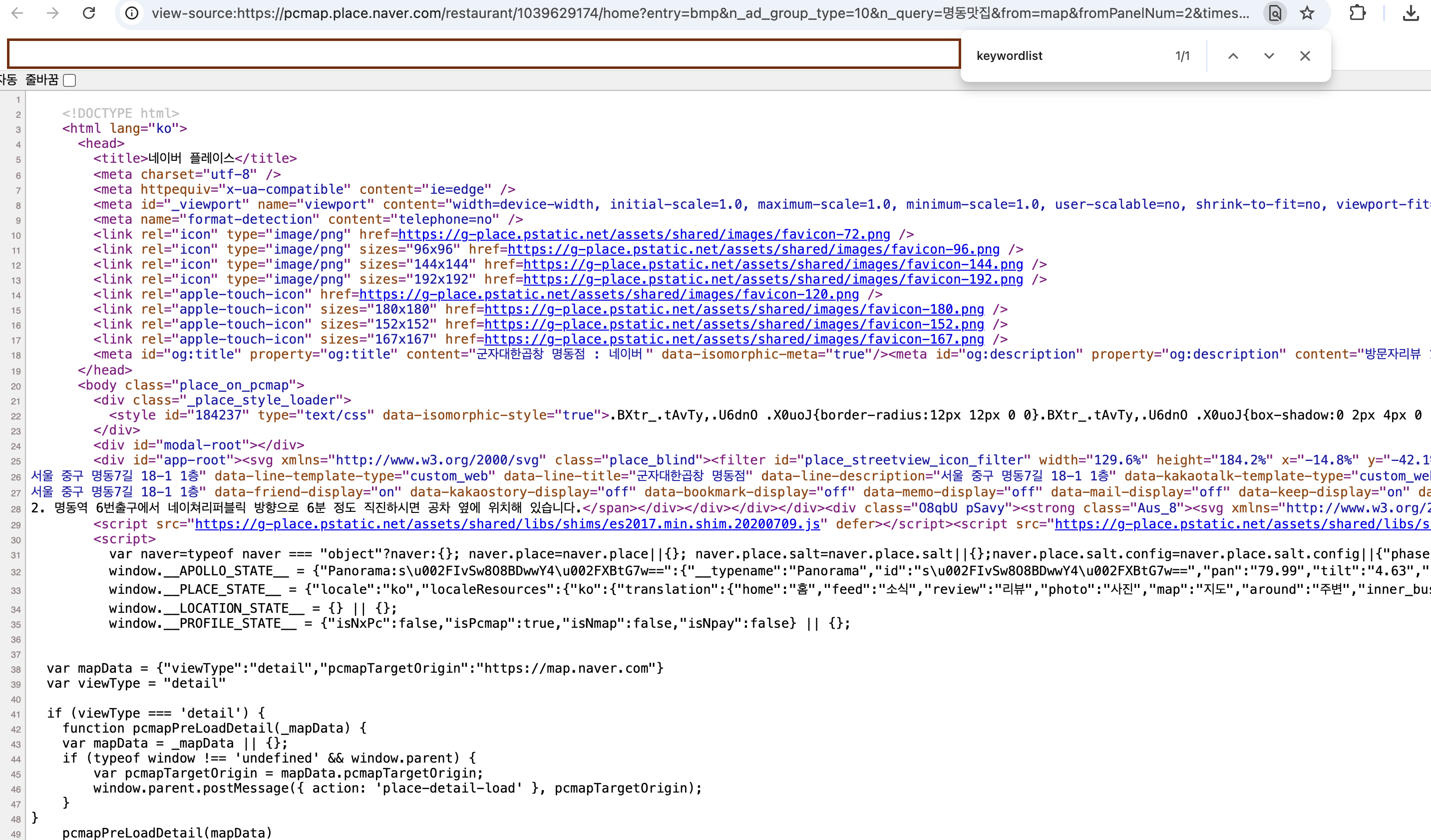 4. 프레임 출처보기를 클릭하면 소스코드가 보이고 Ctrl + F를 누르고 검색창에 “keywordlist” 검색합니다.