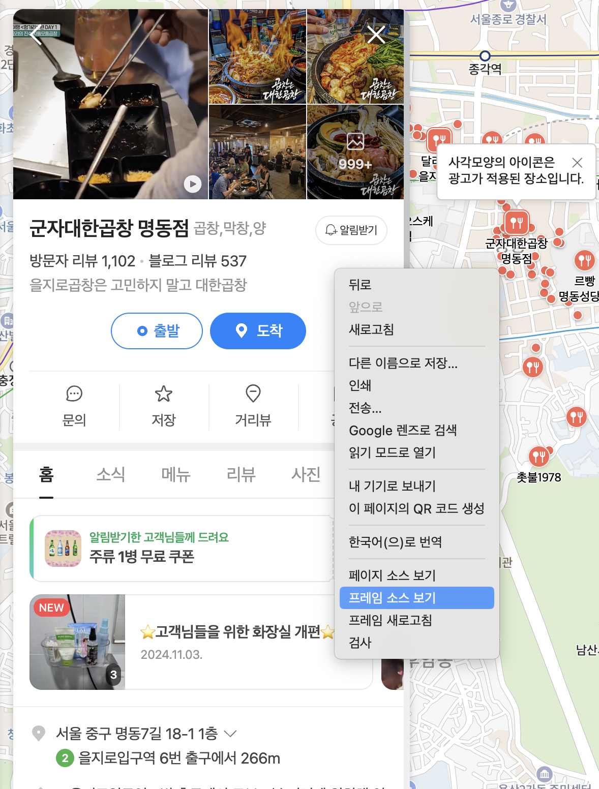 3. 클릭한 플레이스 매장 정보에서 우클릭하고 프레임 출처보기 클릭