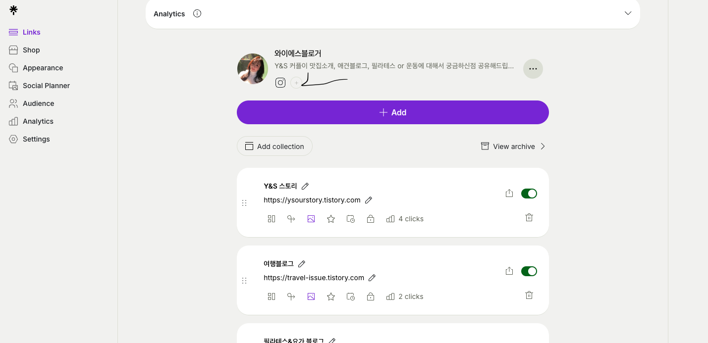 왼쪽 사이드바에서 Links 클릭하면 수정된 프로필과 링크화면이 나타납니다.