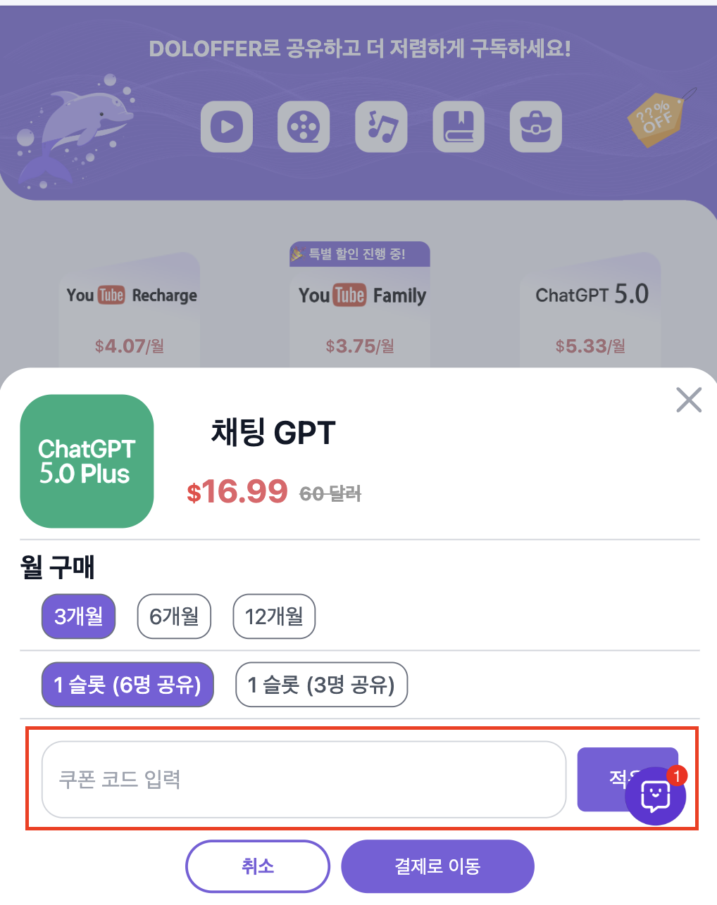 바로 DOLOFFER(돌오퍼) 챗GPT 할인 구독 방식입니다.