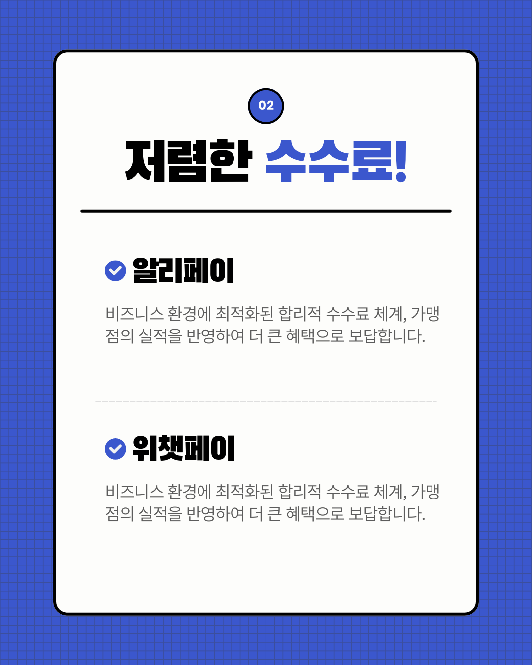 알리페이와 위챗페이는 모두 “비즈니스 환경에 최적화된 합리적 수수료 체계”를 강조하고 가맹점 실적을 반영해 더 큰 혜택으로 보답한다고 안내합니다.