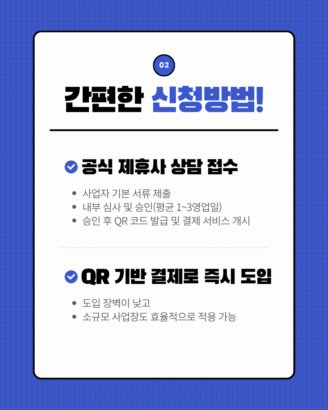 - 공식 제휴사 상담 접수 → 서류 제출 → 내부 심사/승인(평균 1~3영업일) → QR 코드 발급 → 결제 서비스 개시