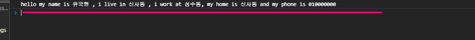 먼저 함수안에 this를 담을 객체가 필요해서 먼저 객체를 생성하고 객체 안에 name에 값을 넣습니다 그리고 showIntorduce 함수를 만들어서 파라미터값에 here , home , phone 넣고 console.log() 안에 값들을 넣어보겠습니다!