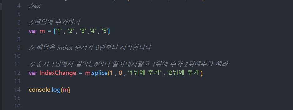 문법또한 이해하기 쉽습니다! Array.splice(시작점 , 길이 , 배열추가 , 배열추가) 이런식인데 아마도 코드를 보시면 훨씬 이해하기가 쉬울꺼 같습니다!