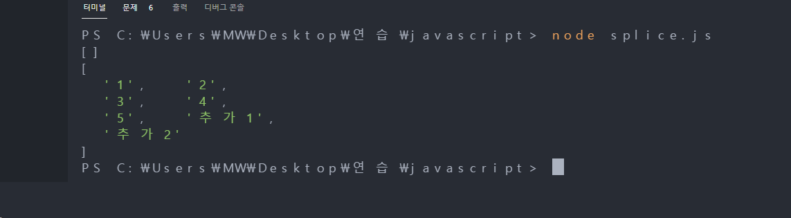 배열을 담고있는 m 안에 배열함수 splice()에 5번째에 길이는 0이고 추가1 추가2 를 추가해줘 이런 문법입니다!