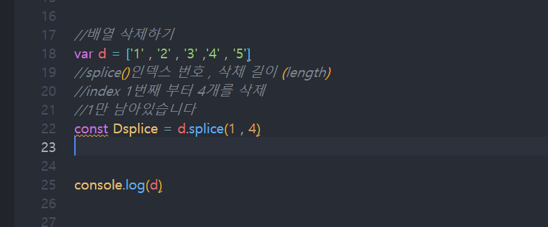 d를 담은 배열변수 d에 splice() 함수 선언 index 1 번에 4개 잘라줘 이런