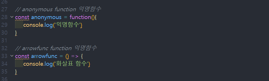 익명함수 즉 이름이 없는함수로 그리고 arrow 함수를 활용해서 함수를 선언할수있습니다!
