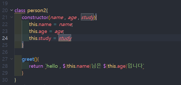 class 선언하고 property을 선언하고 name , age , study 인자 값을 전달하고 method greet 선언합니다