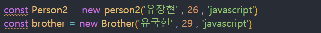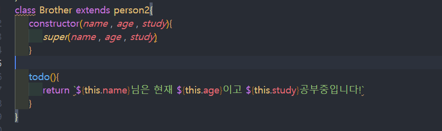 여기서 extends로 brother에 person2를 상속받아서 super로 부모에 property를 상속받아서 같은 name , age , study 값을 전달합니다