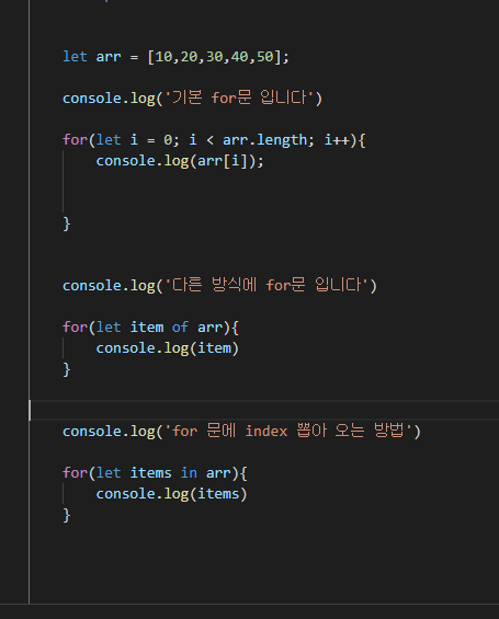 arr 배열에 값을 꺼내고 싶을때 for문이 가장먼저 생각이 나는데 한번 만들어보겠습니다.