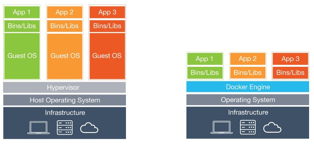 도커의 컨테이너는 어플리케이션 구애받지 않고 쉽게 말해 같이 일하는 다른 개발자들이 개발환경에 구애받지 않고